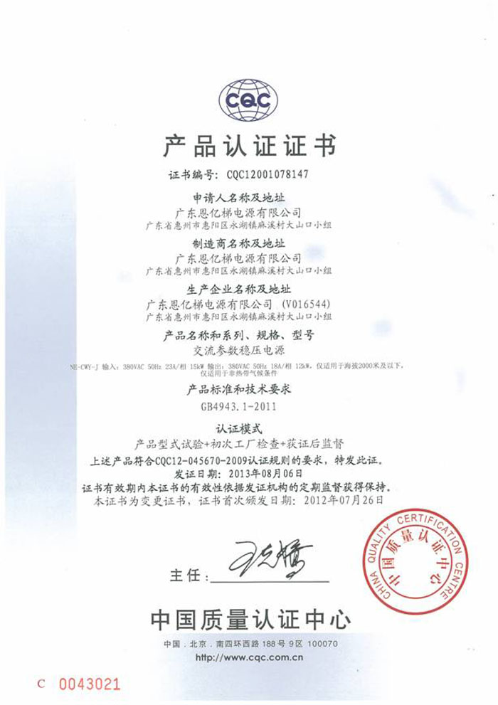 中國國家強制性產品認證(交流參數穩壓電源)
